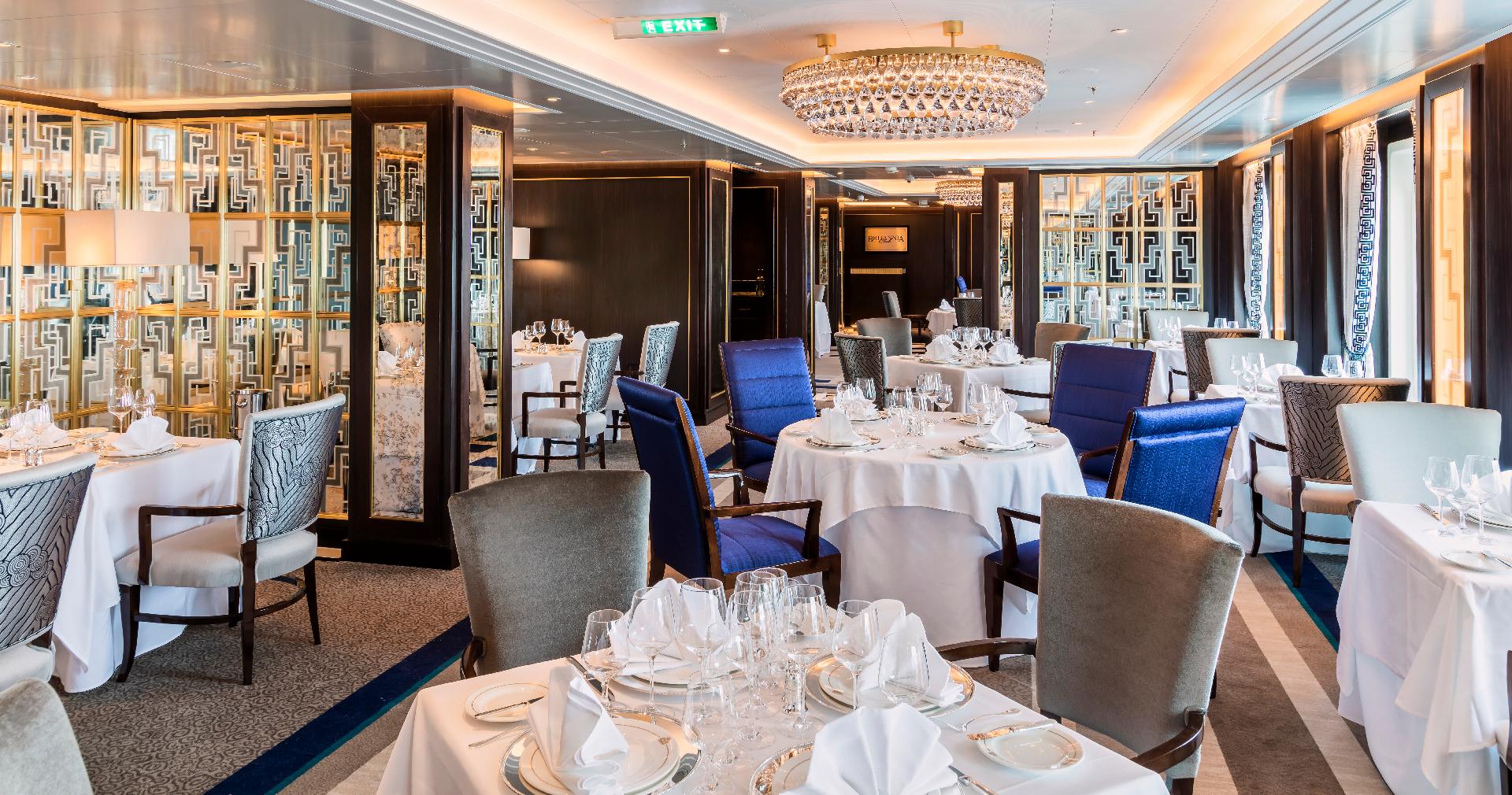 - Restaurante Britannia: comedor principal del barco, con un ambiente majestuoso, techos altos y un servicio estructurado. Sus menús cambian diariamente e incluyen platos clásicos, propuestas contemporáneas y especialidades de temporada.